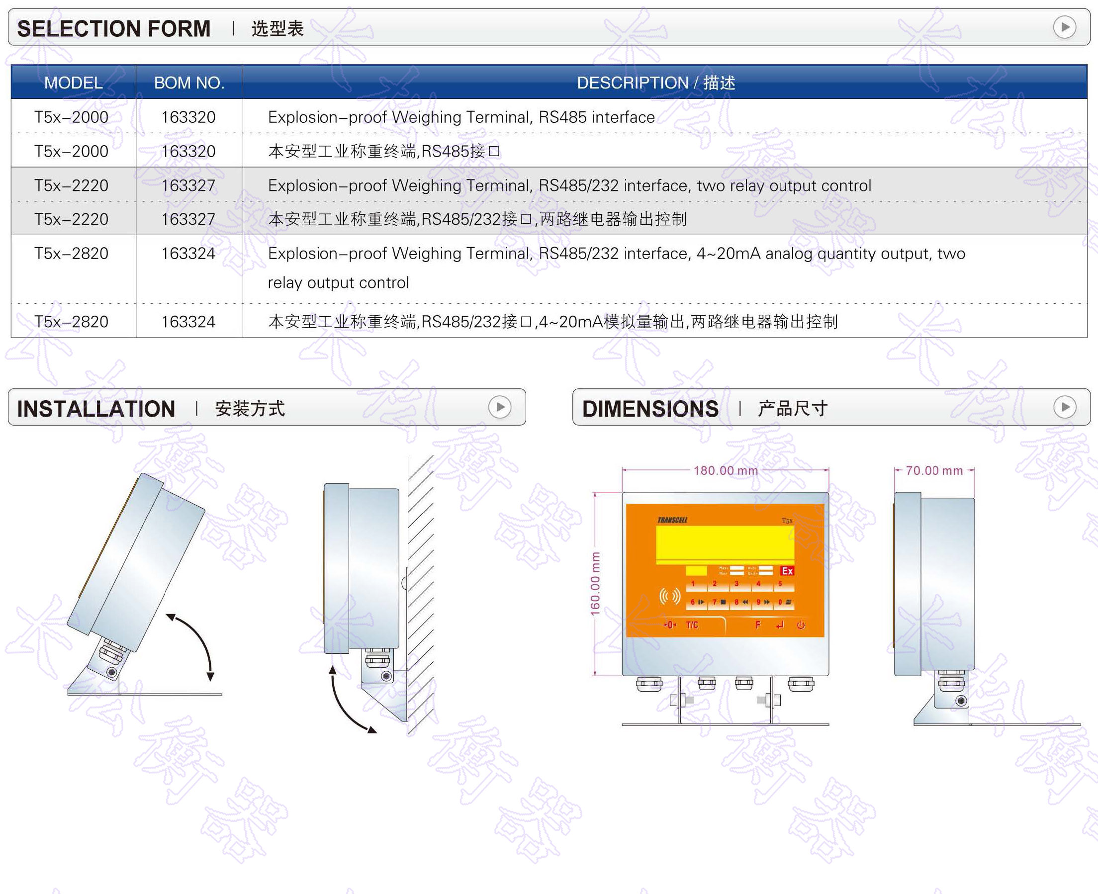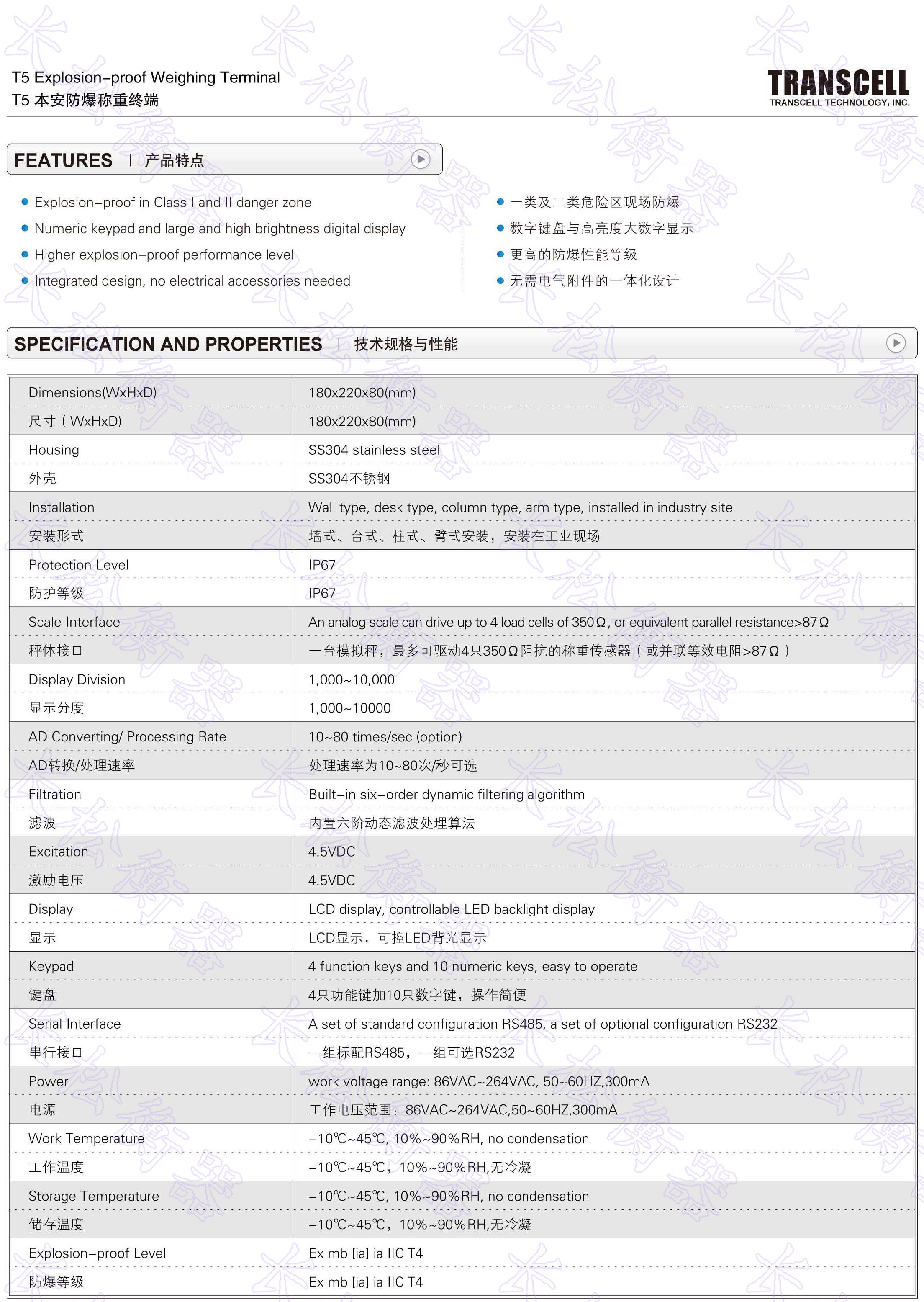 • 產(chǎn)品名稱:美國 Transcell T5 本安防爆稱重終端