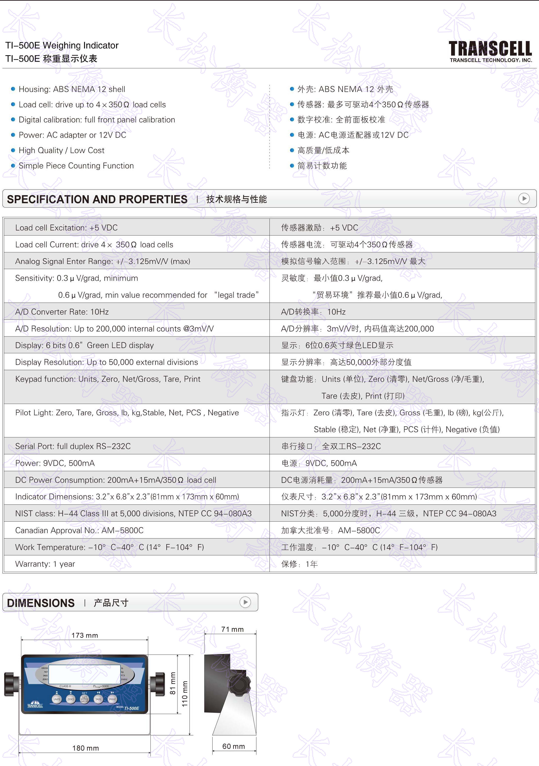 • 產(chǎn)品名稱:美國(guó) Transcell TI-500E 稱重顯示儀表